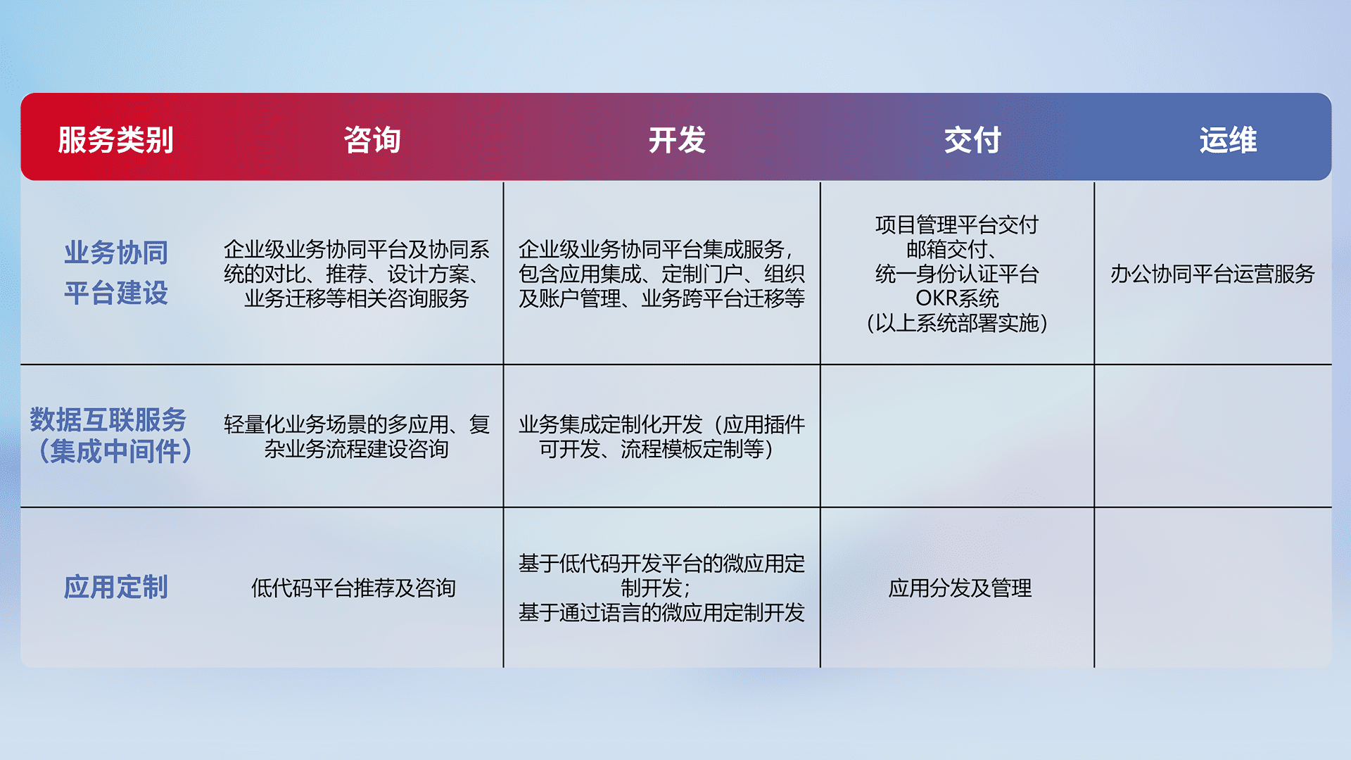 针对钉钉、、、企微、、、、IDaas等平台级产品提供产品的规划、、、、方案、、、交付、、、定制化开发等服务,,,,实现如统一协同办公、、、智能客户服务、、、混合会议管理、、智能数据查询、、等业务场景,,,,实现数字化转型。。。