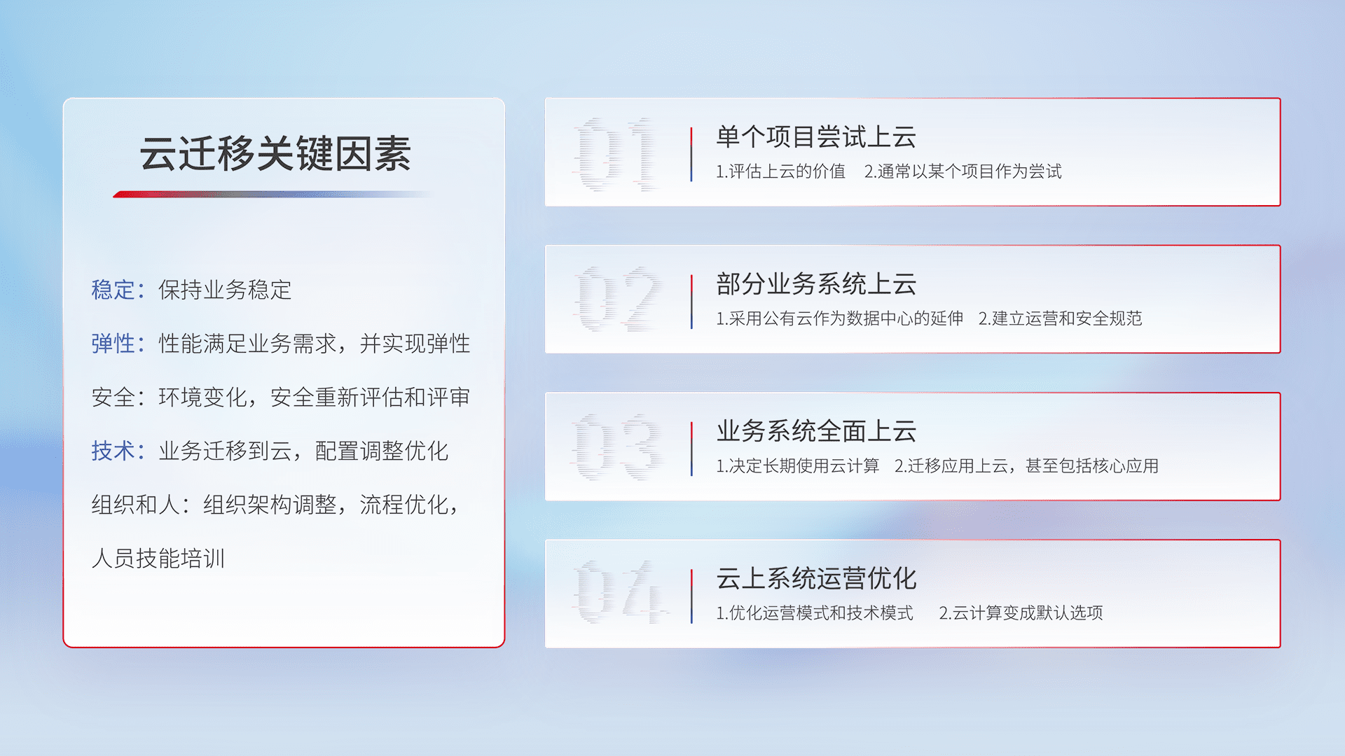 结合实际业务,,,,从规划设计、、、云平台选型、、、、云原生改造、、数据迁移、、集成交付,,迁移全过程为客户识别最佳上云路径,,,做好风险识别管理,,,,设计网络架构、、、、身份权限、、、、安全审计合规、、操作审计、、、日志审计、、、监控告警策略、、多站点容灾设计等,,,对云上基础设施进行整体规划,,,提升IT治理水平,,,以满足弹性、、、、高可用、、高性能的需求。。。。