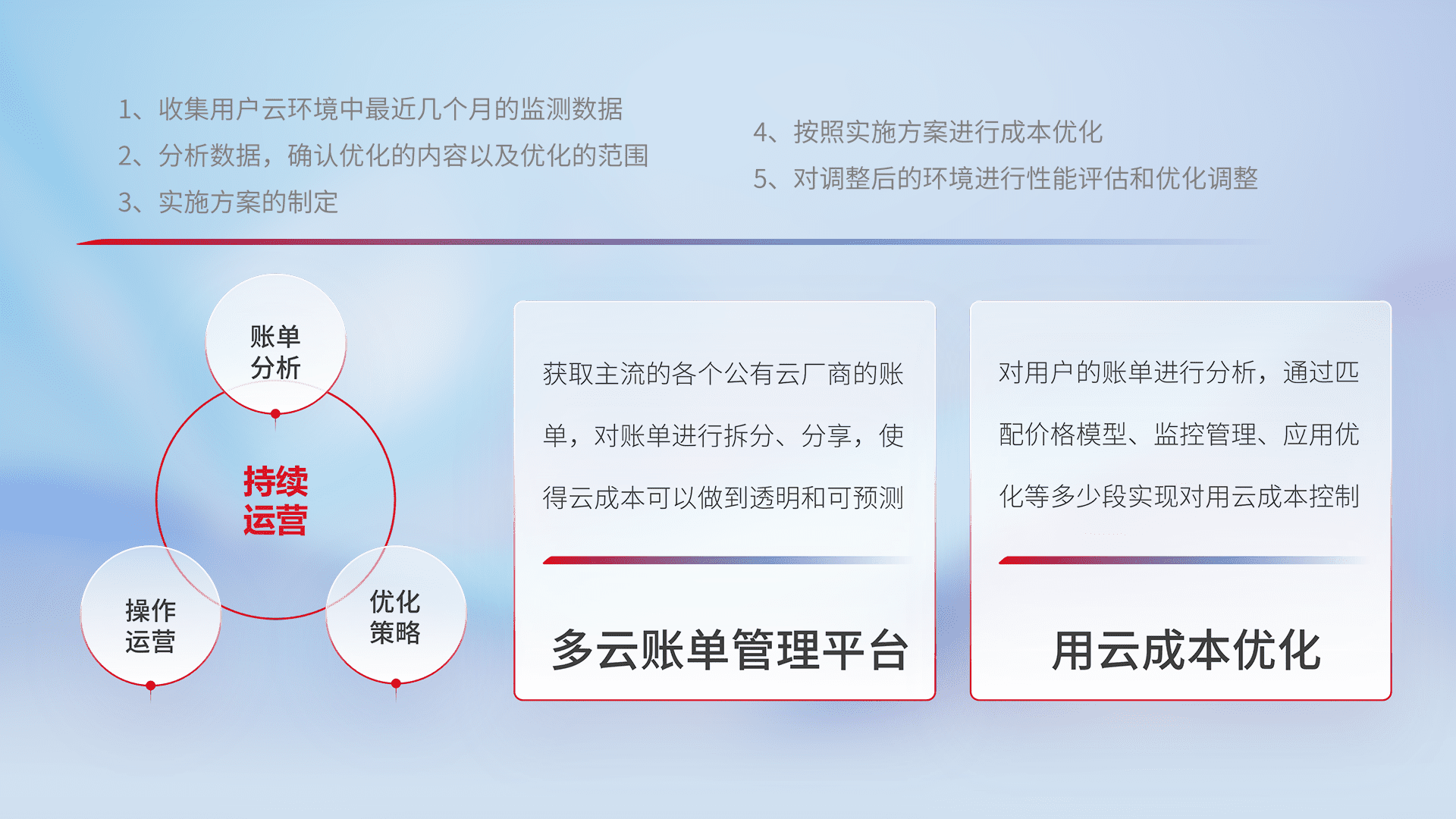 通过多云纳管,,以统一的资源数据模型把客户的云资源进行抽象和封装,,,进而实现对多云资源的统一操作,,,,保障云资源管理的可靠性、、、、稳定性与可用性。。。。量身定制化运维内容,,配置、、、开发运维、、、补丁管理、、、、备份、、监控、、认证和访问管理、、审计和日常巡检等,,,,保障在用云过程中的可靠度,,稳定度以及高可用率。。。